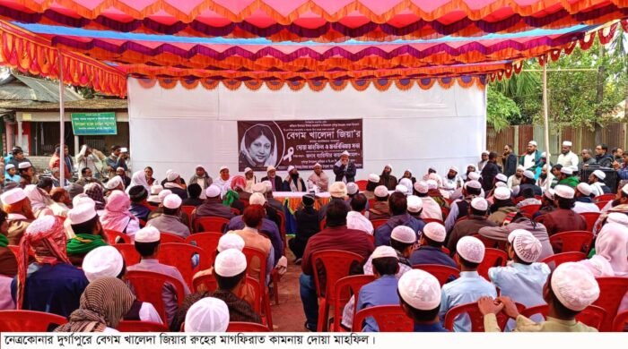 বাংলাদেশের সাবেক তিনবারের সফল প্রধানমন্ত্রী বেগম খালেদা জিয়ার রুহের মাগফিরাত কামনায় নেত্রকোনার দুর্গাপুরে গাওকান্দিয়া ইউনিয়ন বিএনপি ও তার সহযোগী সংগঠনের আয়োজনে এক দোয়া মাহফিল অনুষ্ঠিত হয়েছে। বুধবার (০৭ জানুয়ারী) বাদযোহর
